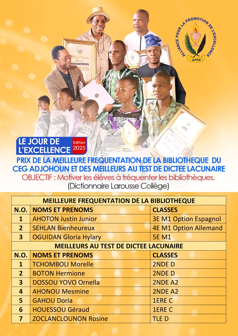 Le 25 octobre 2025, la commune d’Adjohoun a vibré au rythme de l’excellence et de la solidarité lors de la deuxième édition de la Cérémonie de distribution de prix organisée par l’Alliance Pour la Promotion de l’Excellence (APPE). Cette initiative, soutenue par le Département de Loire-Atlantique (France) et d’autres partenaires engagés, a mis à l’honneur les élèves les plus méritants ainsi que ceux en situation de précarité issus des 11 collèges d’enseignement général (CEG) de la commune.